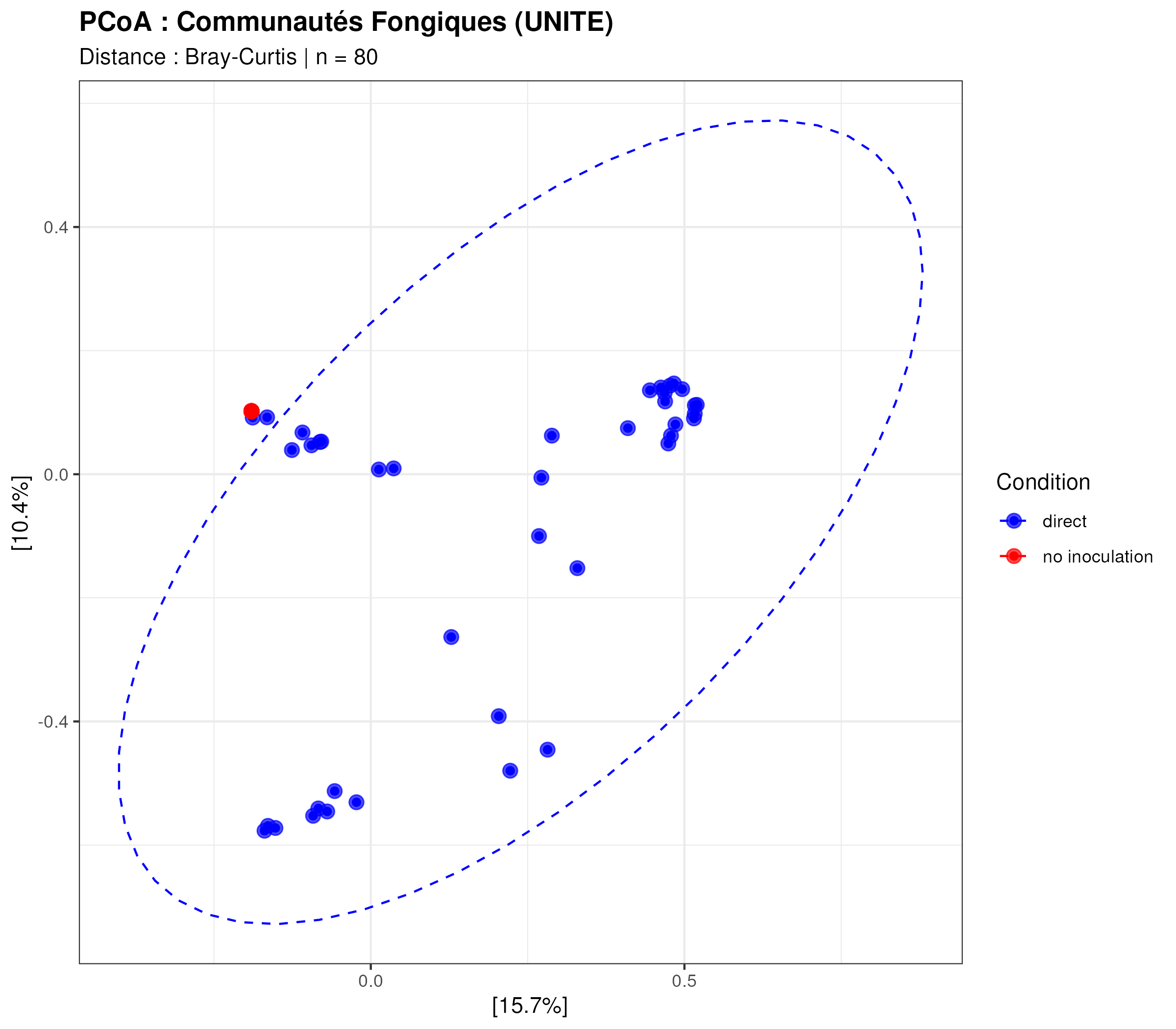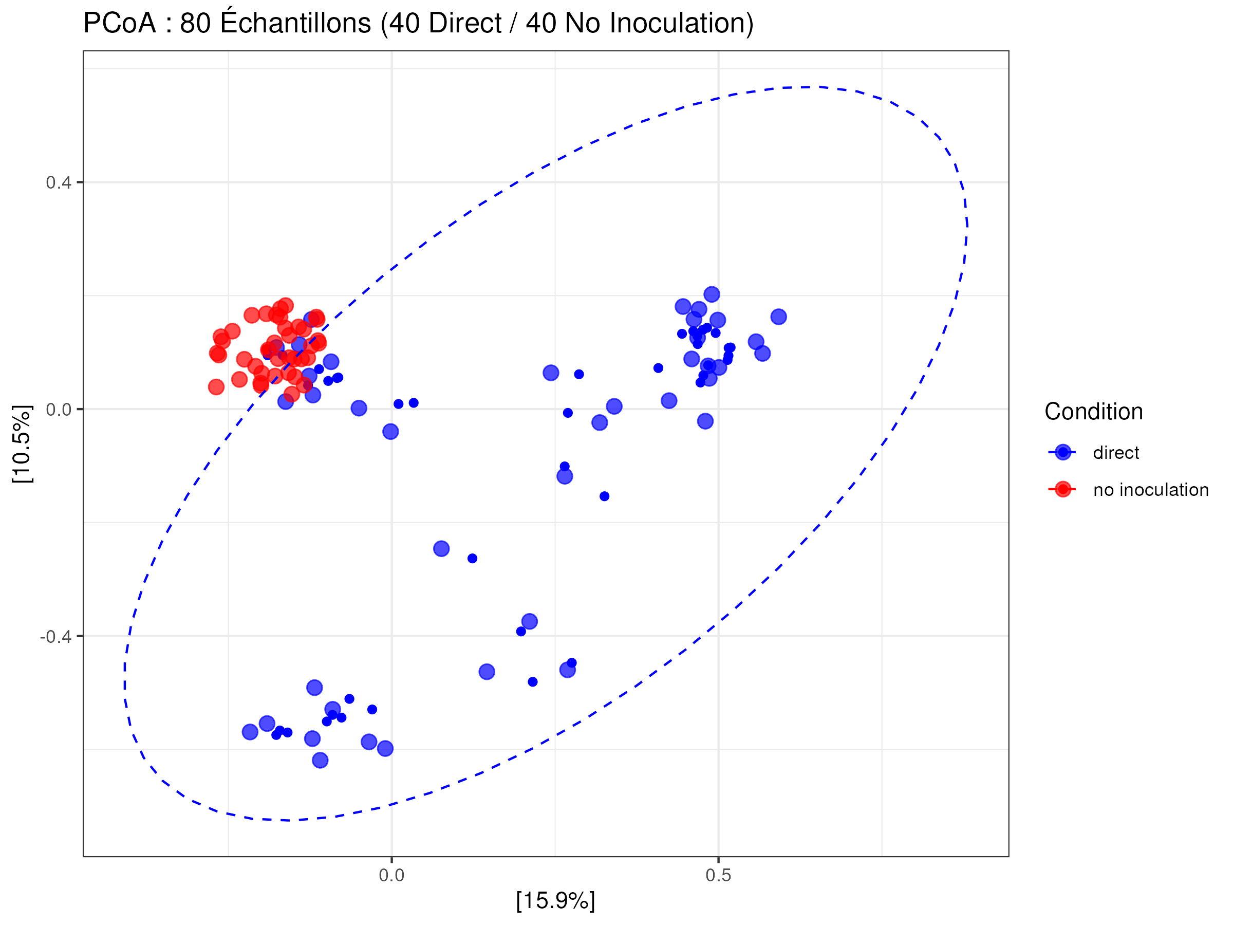 labs(title = "PCoA : 80 Échantillons (40 Direct / 40 No Inoculation)",