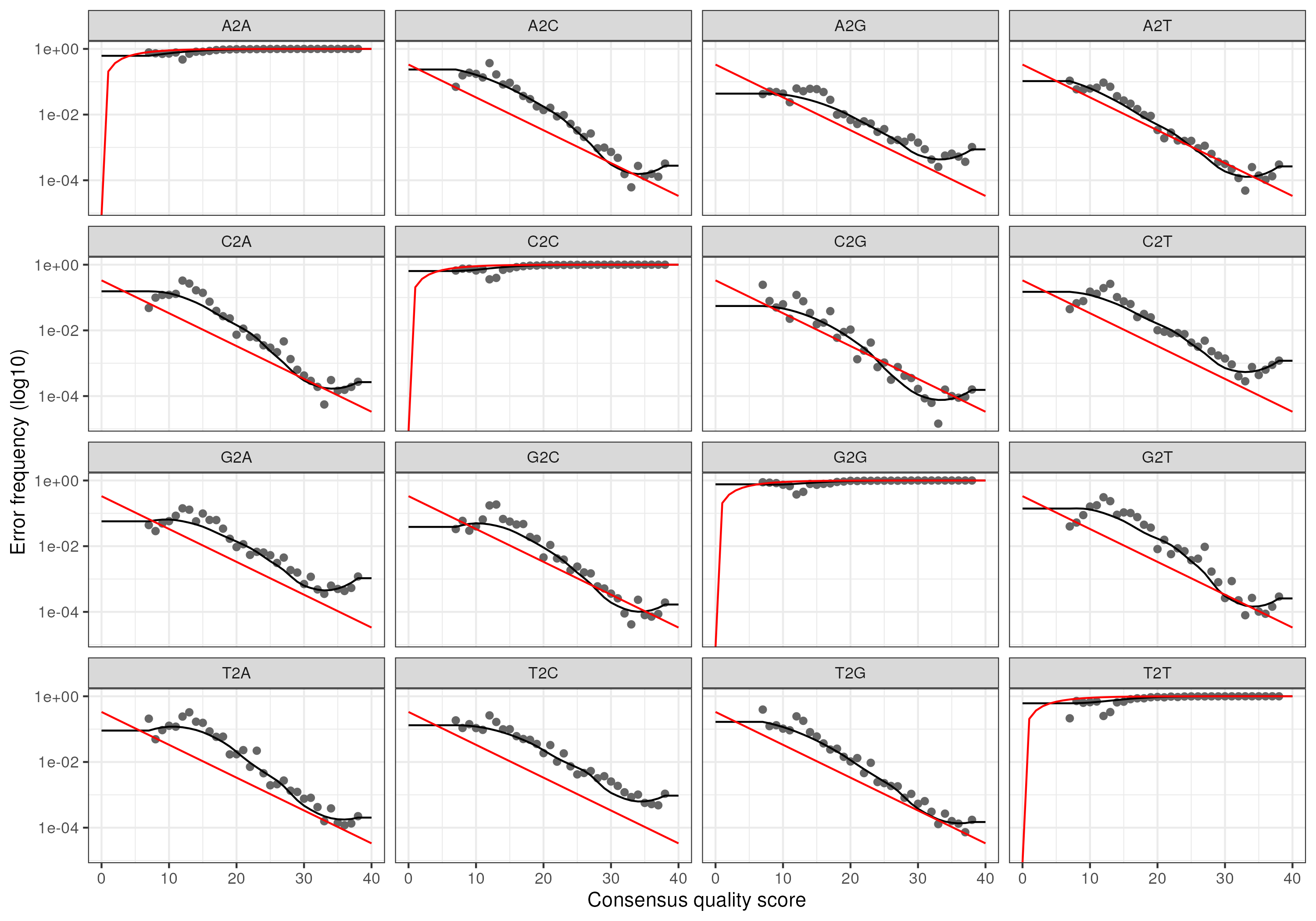 errF <- learnErrors(filtFs, multithread=FALSE)# Modèle statistique des erreurs à partir des lectures filtrées Forward